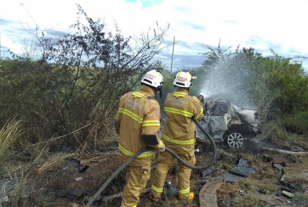 Uma guarnição do Corpo de Bombeiros foi rapidamente deslocada para o local com uma viatura Auto Bomba Tanque (ABT). Ao chegarem, os militares encontraram o automóvel em chamas e realizaram o resfriamento da estrutura para possibilitar a recuperação dos corpos.