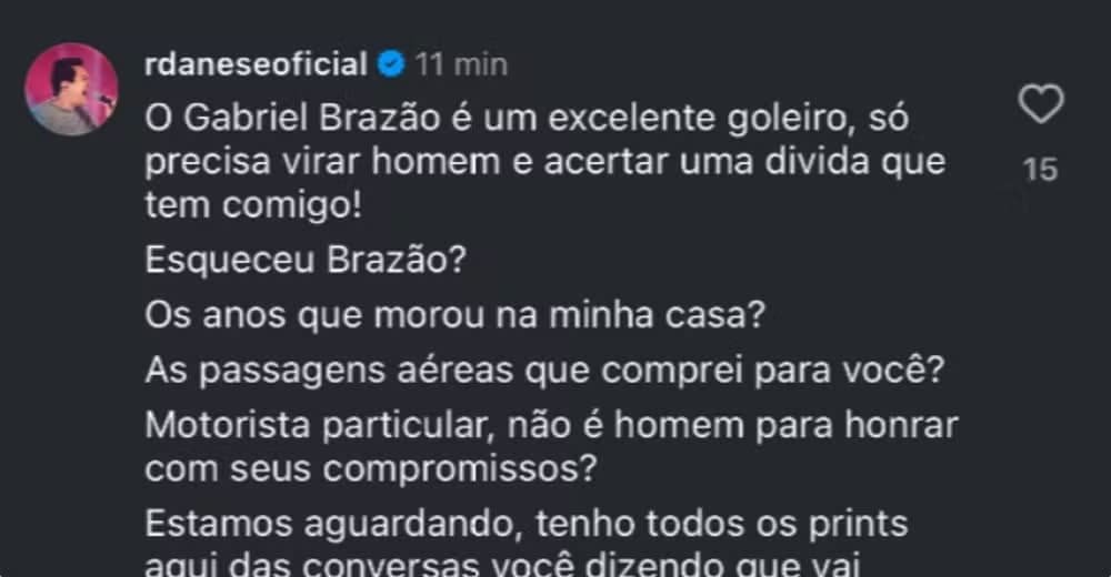 “O Gabriel Brazão é um excelente goleiro, só precisa virar homem e acertar uma dívida que tem comigo! Esqueceu Brazão? Os anos que morou na minha casa? As passagens aéreas que comprei para você? Motorista particular, não é homem para honrar com seus compromissos?”, escreveu o cantor.