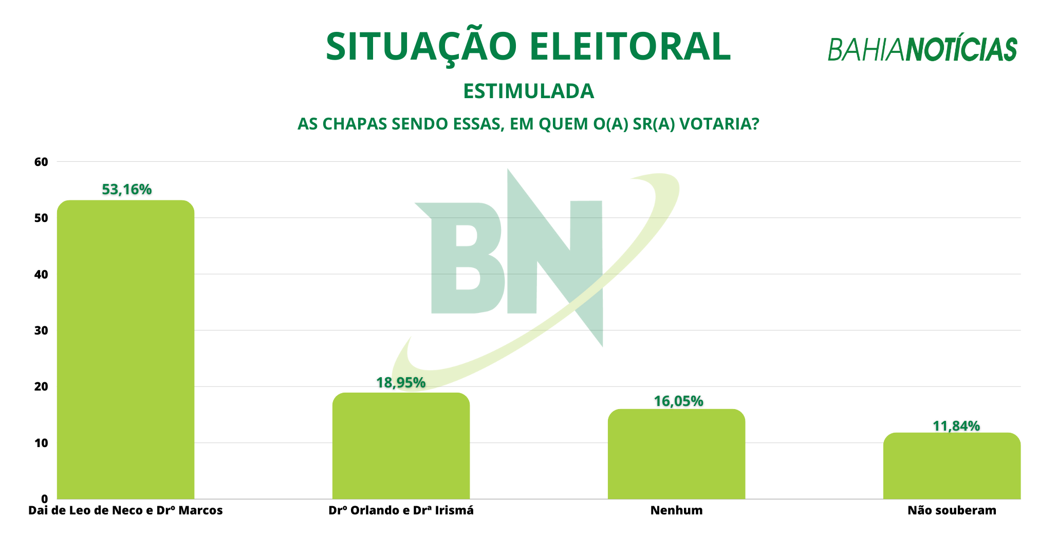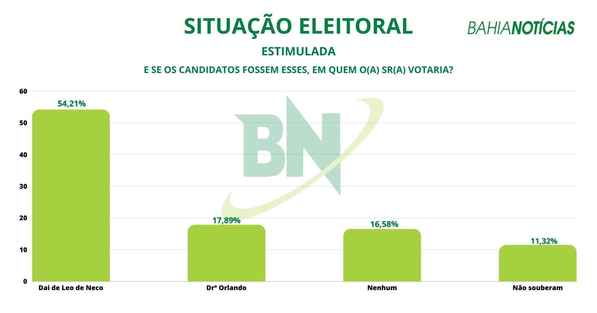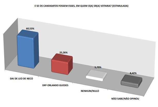 Em um cenário estimulado com os nomes de Dai, Djalma Galvão, Dr. Orlando e enfermeiro Holmes, Dai de Leo de Neco aparece com 50% das intenções de voto. Dr. Orlando aparece em segundo lugar com 30,34% das intenções de voto; Djalma Galvão surge com 2,88% e o Enfermeiro Holmes aparece com 0,85%; Outros 6,95% dos entrevistados responderam que não votariam em nenhum candidato e 8,98% não souberam ou não opinaram.