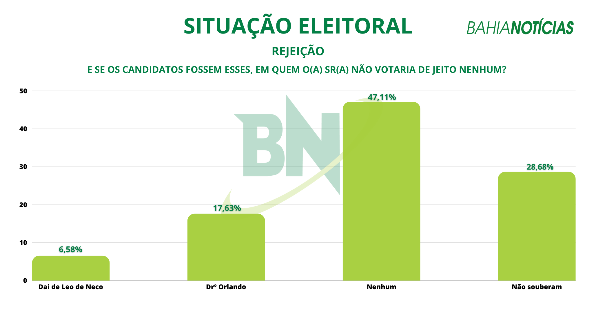 Com relação aos índices de rejeição, quando perguntados sobre “quem eles não votariam de jeito nenhum”, 47,11% dos entrevistados responderam “nenhum” e 28,68% não souberam responder. Dr. Orlando aparece com 17,63% e Dai de Leo de Neco com 6,58%.