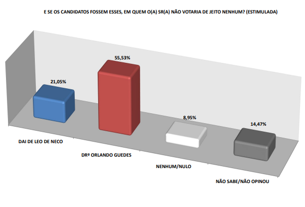 Com relação aos índices de rejeição, quando perguntados sobre “quem eles não votariam de jeito nenhum”, 43,68% dos entrevistados responderam “nenhum” e 33,42% não souberam responder. Dr. Orlando aparece com 13,42% e Dai de Leo de Neco com 9,47%.