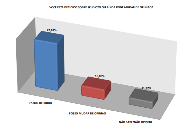 Sobre ter certeza de seu voto, 72,63% afirmaram que não mudariam de opinião quanto a sua escolha para a prefeitura de Gandu. 16,05% disseram que poderiam alterar seu voto até o dia das eleições.