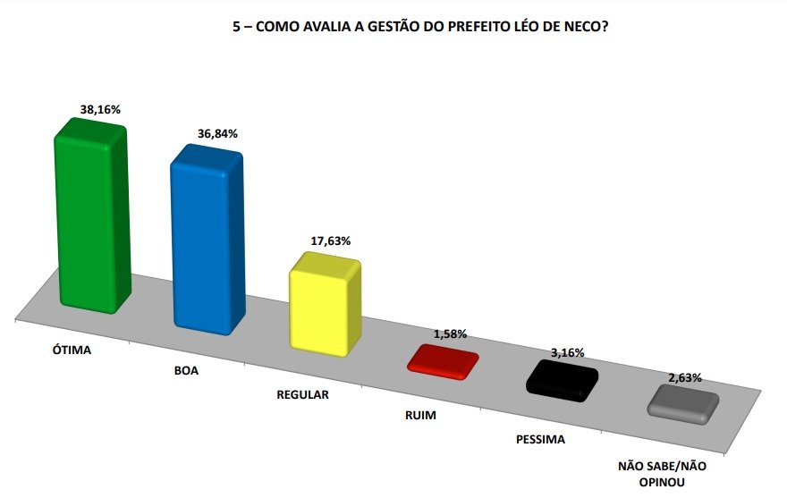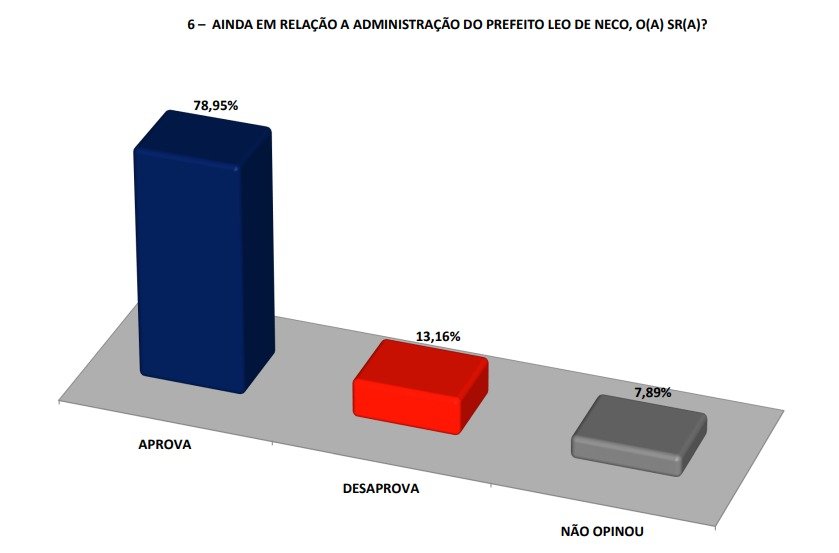 Ainda com relação à administração pública, Leo de Neco teve sua gestão desaprovada por 8,31%. Outros 4,58% não opinaram ou não souberam responder.