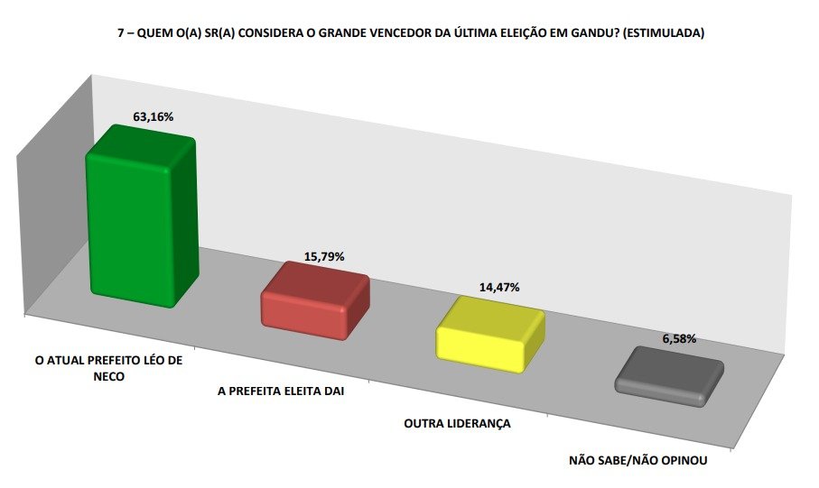 Em cenário estimulado, quando são apresentados os nomes dos atores políticos, 63,16% dos ganduenses apontaram o Léo de Neco como o principal vencedor das eleições municipais, a frente da sucessora eleita, Dai, com 15,79%. 14,47% responderam “outra liderança” e 6,58% não souberam ou não opinaram.