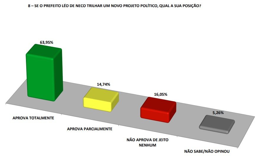 No que diz respeito a futuros planos na política, 63,95% dos cidadãos aprovam totalmente a indicação de Léo de Neco de seguir um novo projeto político. 14,74% aprovam parcialmente e 16,05% não aprovam de jeito nenhum. 5,26% não opinaram.