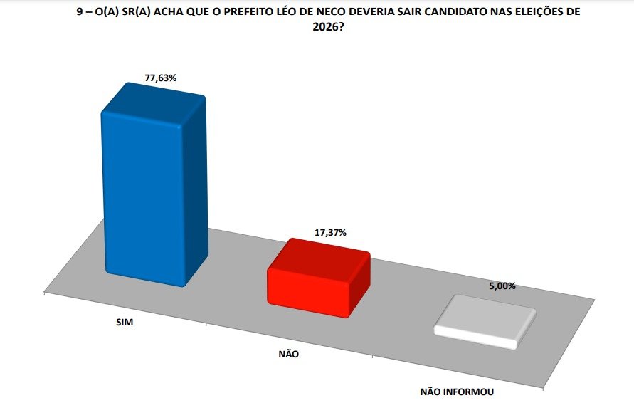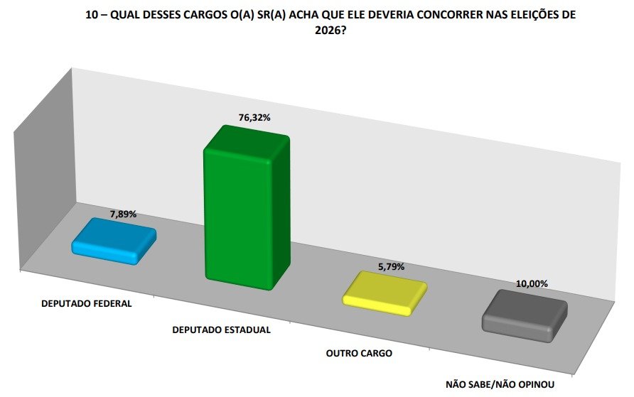 Ainda com relação às eleições de 2026, 76,32% dos ganduenses apontam que Léo de Neco deveria se candidatar a deputado estadual; 7,89% responderam “deputado federal”; 5,79% disseram “outro cargo e 10,00% não souberam ou não opinaram.