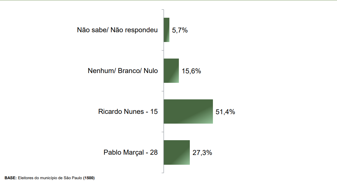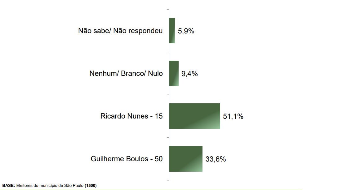 O levantamento também testou a preferência do eleitorado em eventual segundo turno entre Guilherme Boulos e Ricardo Nunes. Para 51,1% dos entrevistados a escolha seria Nunes e 33,6% afirmam que votariam em Boulos.