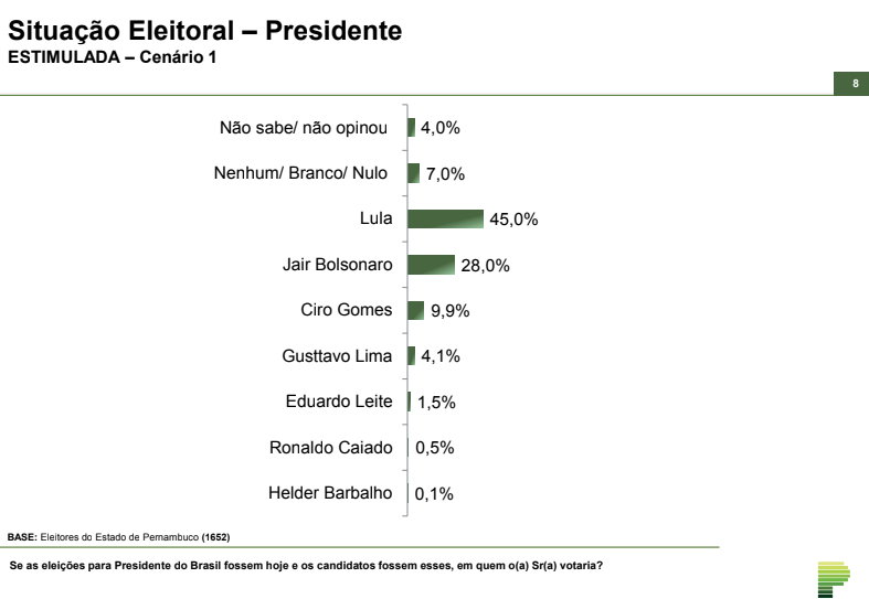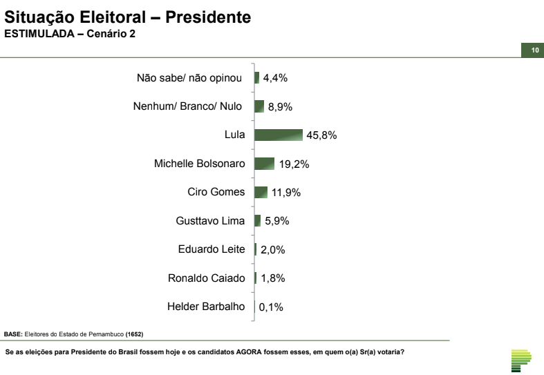 Um levantamento feito pela Paraná Pesquisas em Pernambuco indicou a preferência do eleitorado do estado pelo atual presidente Lula (PT), em uma nova eleição, caso o candidato do PT, Jair Bolsonaro, Ciro Gomes, Gusttavo Lima, Eduardo Leite, Ronaldo Caiado e Helder Barbalho fossem as opções de voto.