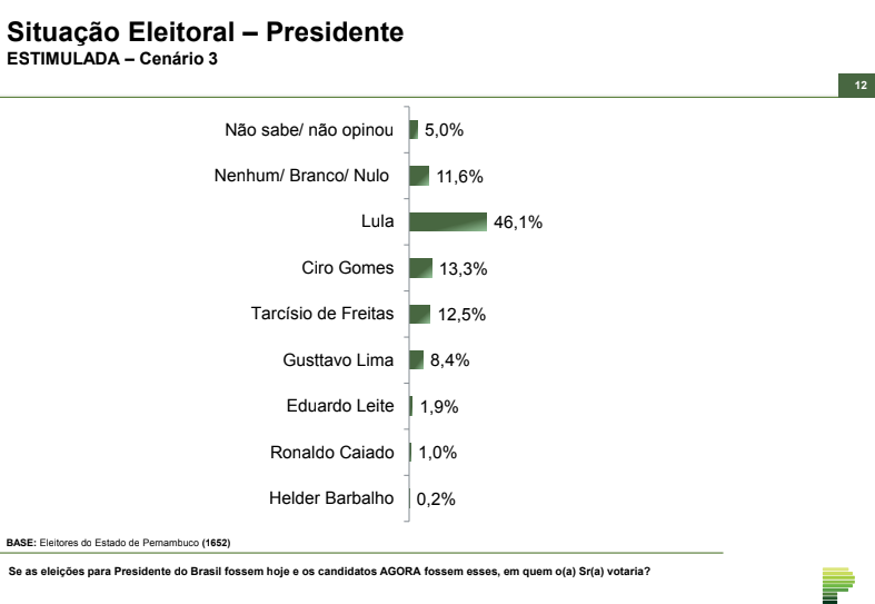 O terceiro e último cenário apresentado não tem como opção Jair Bolsonaro nem Michelle. Desta forma, Lula recebeu 46,1% das intenções de voto dos eleitores pernambucanos, enquanto Ciro ficou em segundo lugar com 13,3%. Tarcísio de Freitas aparece em 3º lugar com 12,5% dos votos, Gusttavo Lima repete a posição em 4º lugar com 8,4%, e os três últimos possíveis candidatos continuam na mesma colocação, Eduardo Leite (1,9%), Ronaldo Caiado (1,0%) e Helder Barbalho (0,2%).