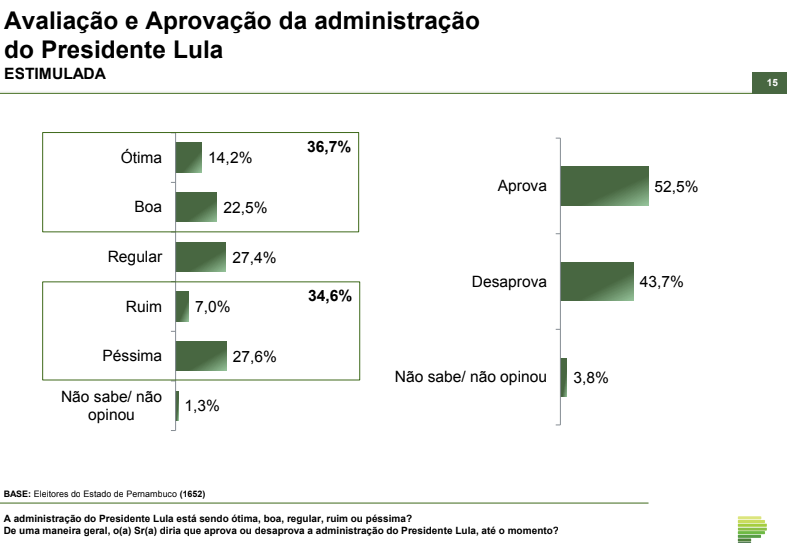 Na mesma pesquisa, o instituto fez uma avaliação da administração do presidente Lula, que indicou 36,7% de aprovação, dividido em 14,2% ótima e 22,5% boa. O petista recebeu 34,6% de reprovação, porcentagem que ficou dividido entre 7,0% ruim e 27,6% péssima. Cerca de 27,4% escolheram a opção regular.