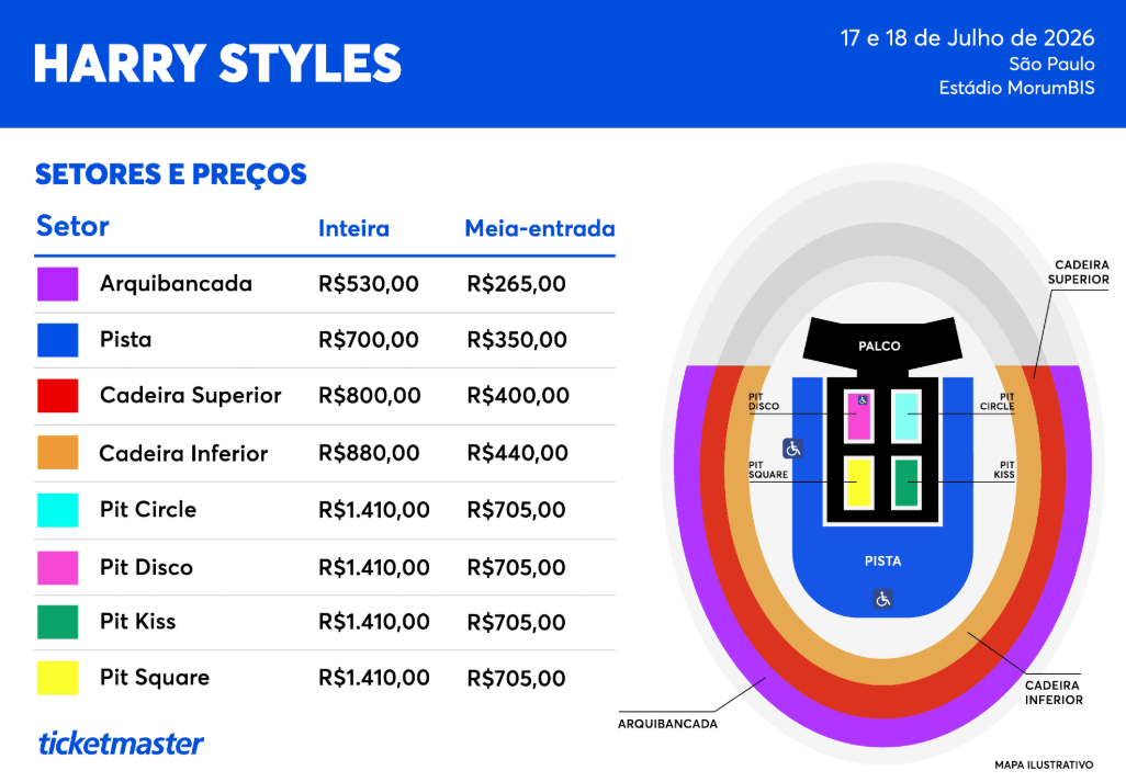 O estádio MorumBIS foi dividido em oito setores, tendo o mais exclusivo deles o Pit, que fica em frente ao palco e conta com 4 pontos, o Pit Circle, Pit Disco, Pit Kiss e Pit Square. Quem quiser ficar pertinho do ex-One Direction terá que desembolsar R$ 1.410,00 na inteira, ou R$ 705,00 na meia entrada.