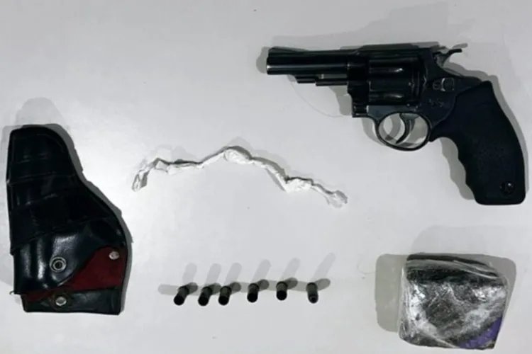 Revólver calibre 32 e drogas encontradas e apreendidas pela PM | Foto: Reprodução / Ascom