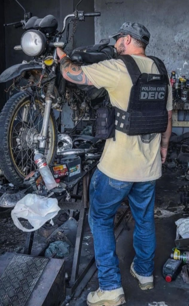 No local, os agentes da Delegacia Especializada de Repressão a Furtos e Roubos (DRFR) de Vitória da Conquista apreenderam cinco motocicletas desmanchadas, diversas peças de motos furtadas, ferramentas e um celular foram apreendidos na oficina. O outro suspeito, de 38 anos, foi detido com uma moto com numerações do chassi e motor adulteradas.