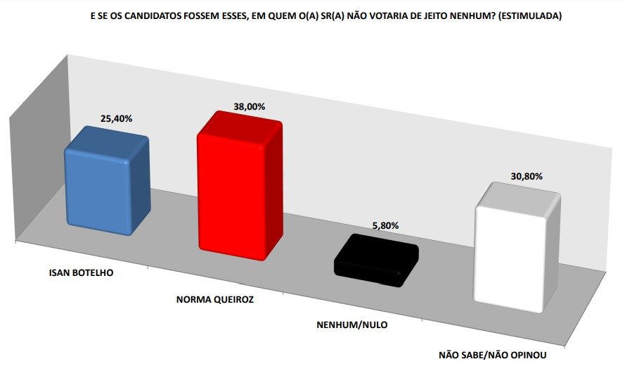 Em entrevista estimulada, quando são apresentados os nomes dos candidatos, Isan Botelho (Avante) desponta em 54,80% das intenções de voto, contra 26,60% de Norma Queiroz (MDB), principal candidata da oposição. 2,80% dos entrevistados não votaria em nenhum e 15,80% não souberam ou não responderam.