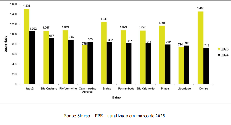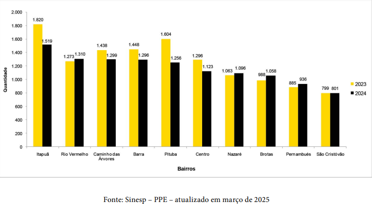 Além de Itapuã, a Pituba também apresentou queda significativa nos furtos, passando de 1.604 para 1.256 casos, uma redução de 21%.