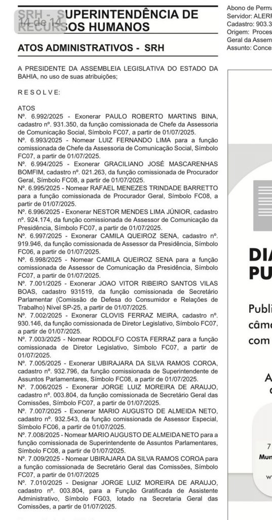 No texto publicado nesta quarta, Ivana também determinou a extinção do cargo de Secretário Parlamentar no nível SP-13A. O posto havia sido criado pelo atual senador Angelo Coronel (PSD) em 2017, por meio da resolução nº 1770, quando ele presidia a AL-BA.