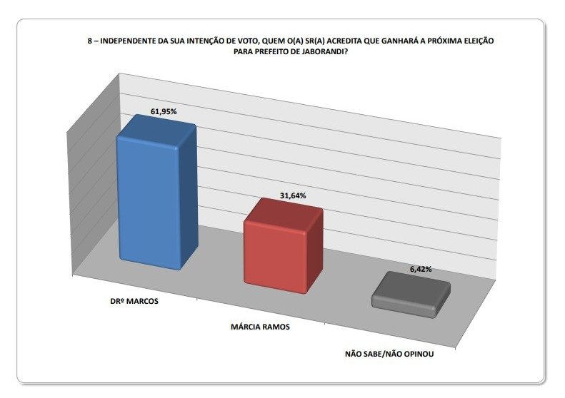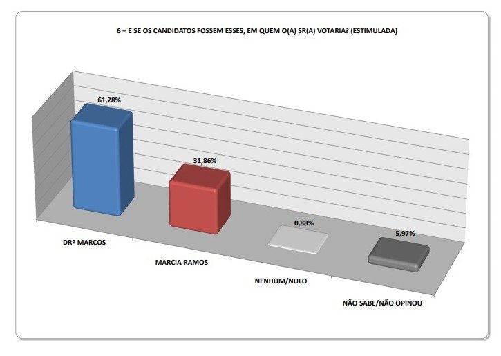 Quando questionados sobre quem venceria a eleição, independente da preferência, os entrevistados mantiveram a tendência dos outros cenários. Doutor Marcos pontuou 61,95% e Márcia Ramos registrou 31,64%.