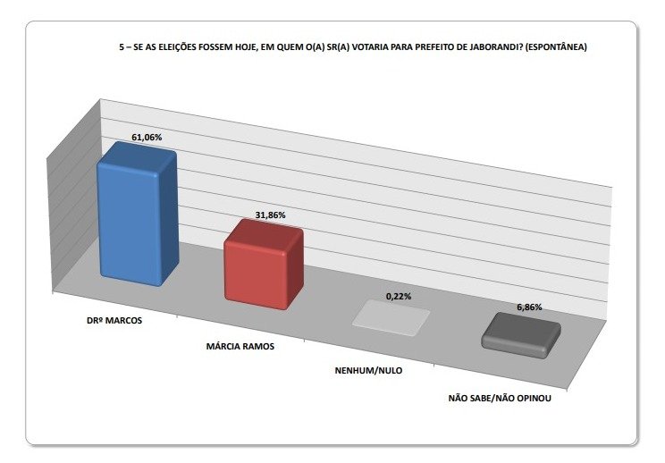 O atual prefeito de Jaborandi, Doutor Marcos (PSD), liderou as intenções de voto e seria reeleito no município, segundo pesquisa do Instituto Séculus, encomendada pelo Bahia Notícias. O gestor pontuou 61,28% no cenário estimulado, enquanto sua opositora Márcia Ramos (PSDB) chegou aos 31,86%.
