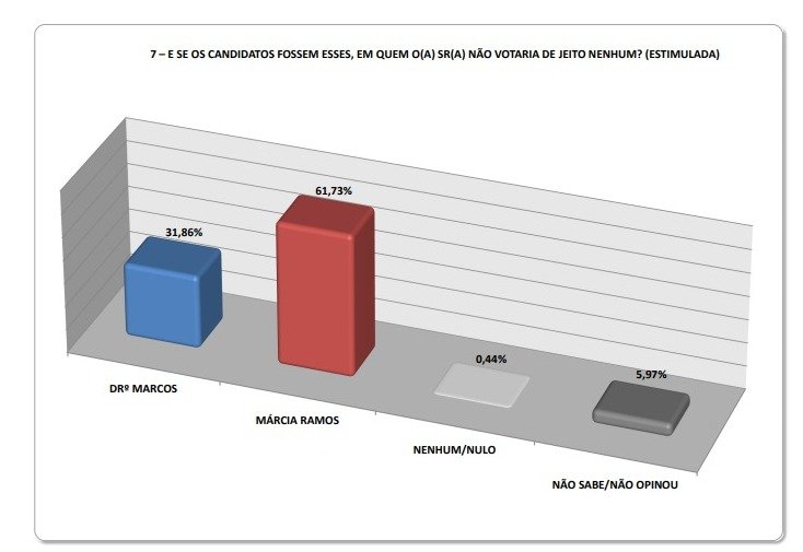 Sobre a rejeição dos dois candidatos, 61,73% dos eleitores afirmaram que não votariam em Márcia Ramos e 31,86% declaram ser opositores ao atual prefeito.