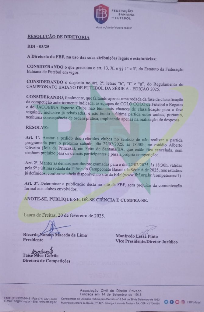 “Venho aqui comunicar oficialmente minha saída do Jacobina Esporte Clube. Renuncio ao cargo de diretor de futebol. Fui informado por uma pessoa que o Jacobina não recebe o apoio devido do poder público nem do empresariado local devido à minha presença no clube. Portanto, saio do Jacobina em definitivo para não impedir que outras pessoas se aproximem do clube. Deixo o cargo de cabeça erguida, pelos 12 anos em que estive na linha de frente e pelos 12 anos em que lutamos por este clube”, declarou.