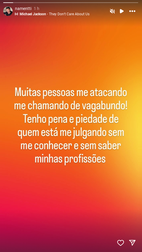 “Muitas pessoas me atacando me chamando de vagabundo! Tenho pena e piedade de quem está me julgando sem me conhecer e sem saber minhas profissões”, continuou através de seus stories.