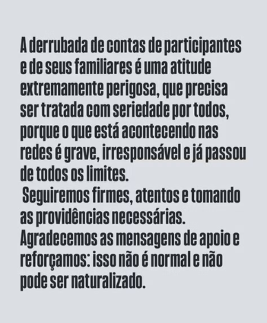 "A derrubada de contas de participantes e de seus familiares é uma atitude extremamente perigosa, que precisa ser tratada com seriedade por todos, porque o que está acontecendo nas redes é grave, irresponsável e já passou de todos os limites", diz o comunicado.