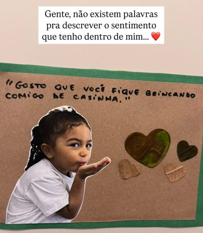 Na gravação, Lore ainda mostra outros momentos, como um cartão feito com a foto da pequena que diz o que ela mais gosta de fazer com a mãe: "Gosto que você fique brincando comigo de casinha".