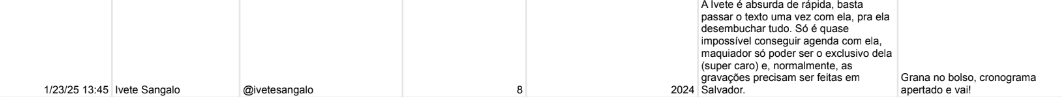 Ivete Sangalo: a cantora recebeu um 8 por um trabalho feito em 2024. Apesar de não ter tirado a nota máxima na avaliação, a artista foi elogiada pela entrega. A queixa envolvendo a cantora foi o valor do maquiador. Segundo a pessoa que avaliou, a artista faz uma exigência para ter as publis gravadas em Salvador.