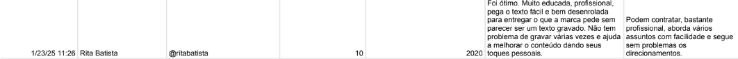 Rita Batista: a jornalista baiana foi avaliada com um 10 por um trabalho feito em 2020. Para quem avaliou, a jornalista é extremamente profissional, desenrolada e tem habilidade de falar diversos assuntos com facilidade.