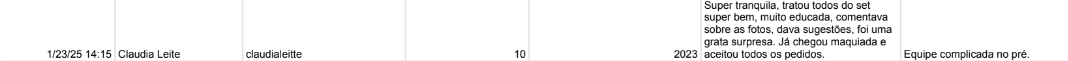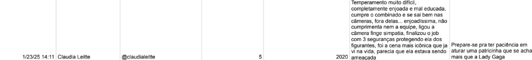 Claudia Leitte: a artista foi avaliada com um 10 por um trabalho prestado em 2023. "Super tranquila, tratou todos do set super bem, muito educada, comentava sobre as fotos". A equipe da cantora, no entanto, foi avaliada como complicada. A artista ainda recebeu uma segunda nota, um 5 por um trabalho prestado em 2020, na qual dizia que a cantora tinha um temperamento difícil e era mal-educada. O texto conta que Claudia Leitte teria precisado de seguranças para protegê-la dos figurantes. "Uma patricinha que se acha mais que a Lady Gaga".