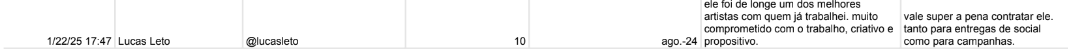 Lucas Leto: o ator, que estará presente no remake de 'Vale Tudo', também recebeu 10 por um trabalho feito em agosto de 2024. De acordo com a planilha, o baiano é dedicado, criativo e propositivo.