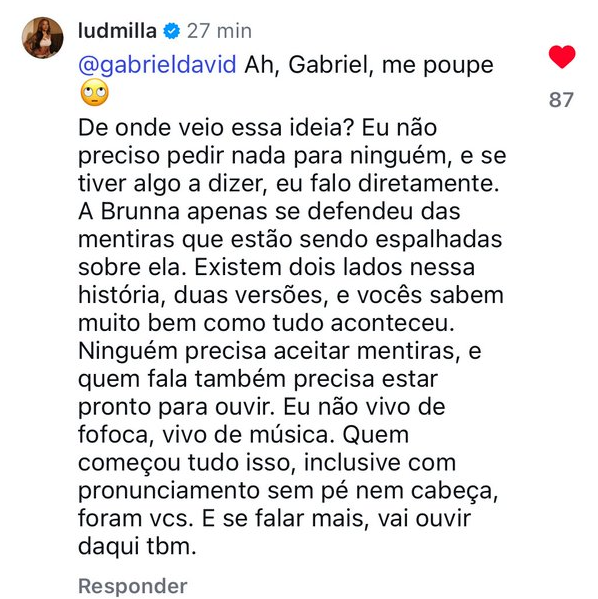 A confusão passou a envolver Ludmilla e Gabriel David, que trocaram farpas nos comentários de uma postagem no Instagram.