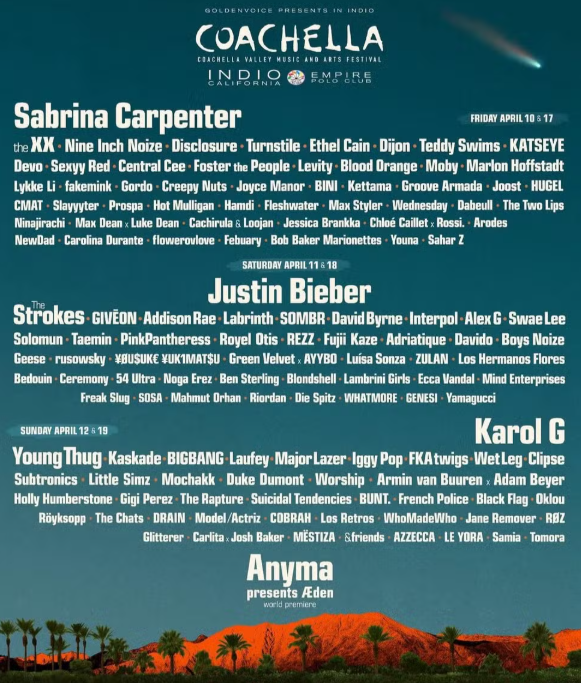 Sonza se apresenta em dois finais de semana, no dia 11 e no dia 18 de abril. No mesmo dia da artista, além de Justin Bieber, estão The Strokes, Labrinth e Interpol.
