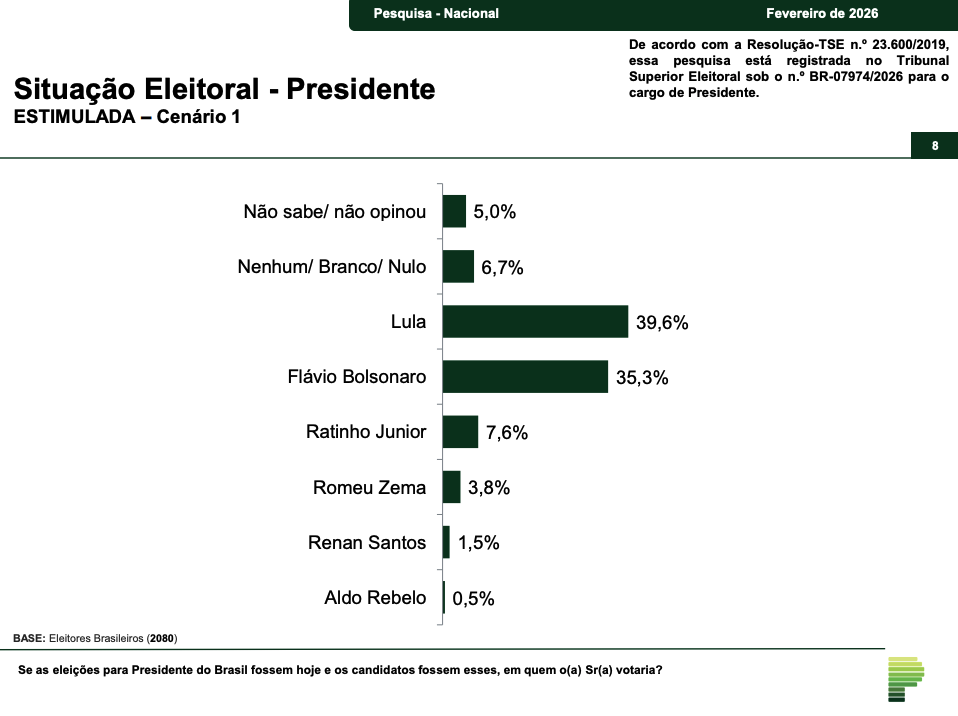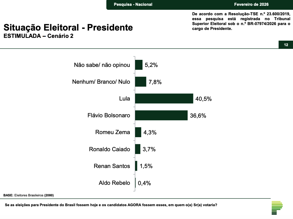 O levantamento é o primeiro realizado pelo instituto desde o lançamento oficial de Flávio como pré-candidato pelo ex-presidente Jair Bolsonaro. A pesquisa ouviu 2.004 eleitores em 137 municípios, entre os dias 3 e 5 de março. A margem de erro é de dois pontos percentuais para mais ou para menos, e o registro na Justiça Eleitoral é o BR-03715/2026.