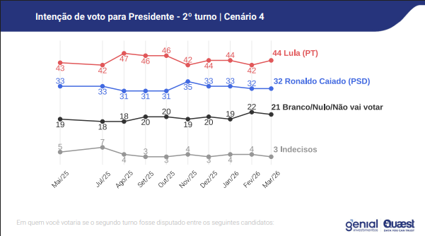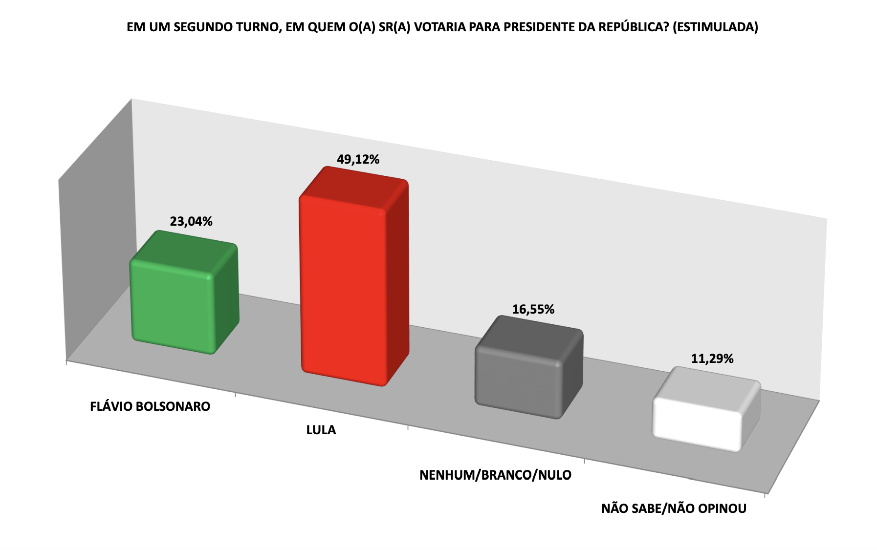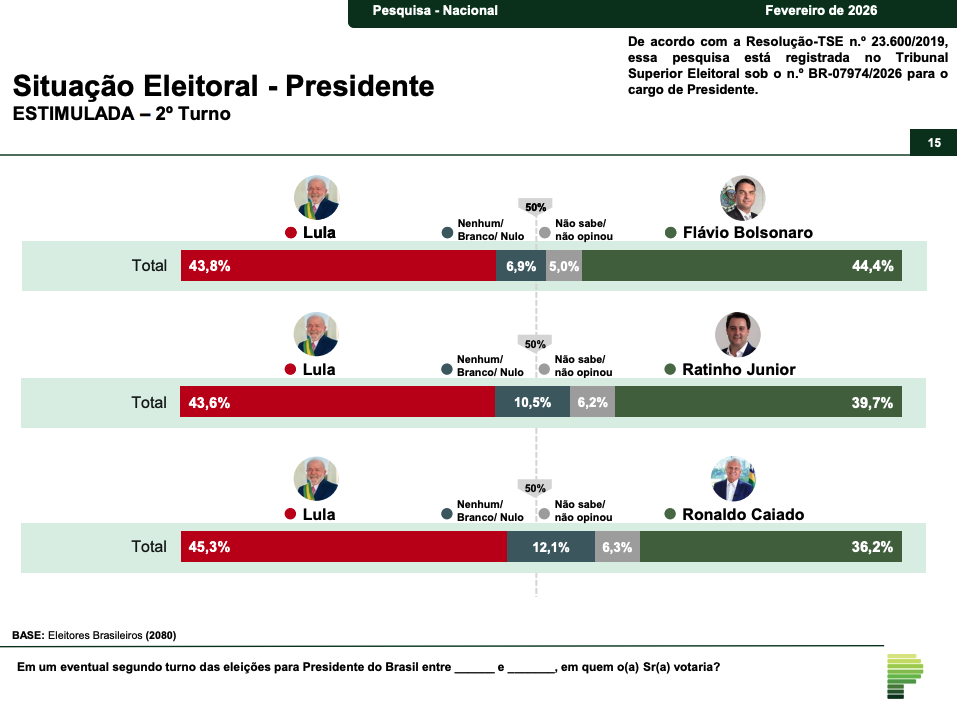 O instituto também simulou um eventual segundo turno entre Lula e Flávio Bolsonaro. Nesse cenário, Lula aparece com 49,12% das intenções de voto, enquanto Flávio Bolsonaro registra 23,04%. Entre os entrevistados, 16,55% indicaram voto em branco, nulo ou em nenhum dos dois nomes, e 11,29% disseram não saber ou não opinar.