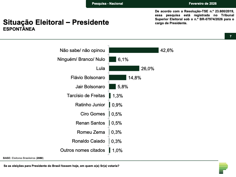 Nas intenções de voto espontâneas — quando não são apresentados nomes aos entrevistados — Lula oscilou de 24% para 25%, enquanto Flávio Bolsonaro surgiu com 12%. Jair Bolsonaro, atualmente inelegível, foi citado por 3% dos eleitores.