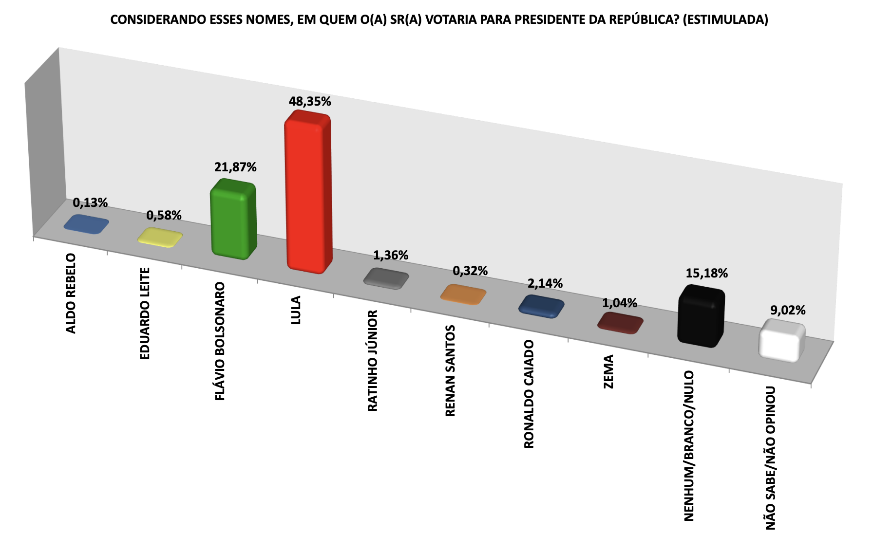 De acordo com os dados divulgados nesta quarta-feira (4), Lula aparece com 48,35% das intenções de voto entre os entrevistados. Em segundo lugar está o senador Flávio Bolsonaro (PL), com 21,87%. Na sequência aparecem Ronaldo Caiado, com 2,14%; Ratinho Júnior, com 1,36%; Zema, com 1,04%; Eduardo Leite, com 0,58%; Renan Santos, com 0,32%; e Aldo Rebelo, com 0,13%.