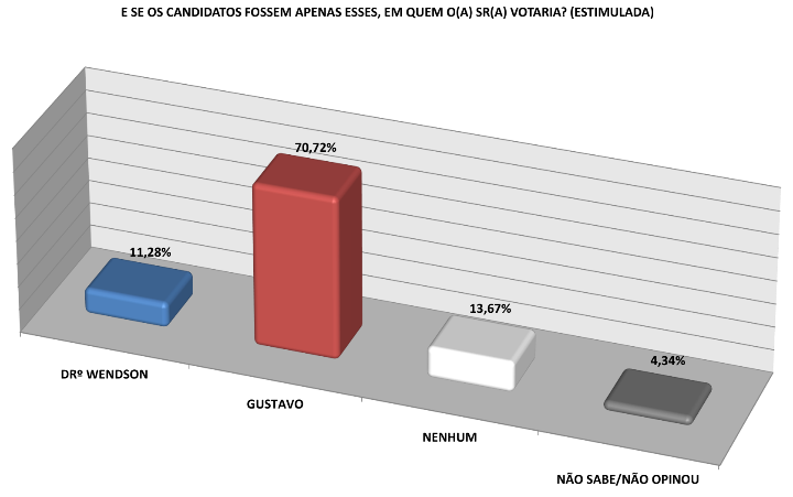 No único cenário simulado pela pesquisa, Gustavo de Capeta, que é o atual vice-prefeito da cidade, aparece com 70,72% das intenções de voto, contra 11,28% de Drº Wendson (PCdoB). Aqueles que afirmaram que não votariam em nenhum dos nomes somaram 13,67% dos entrevistados, enquanto 4,34% não souberam ou não opinaram.