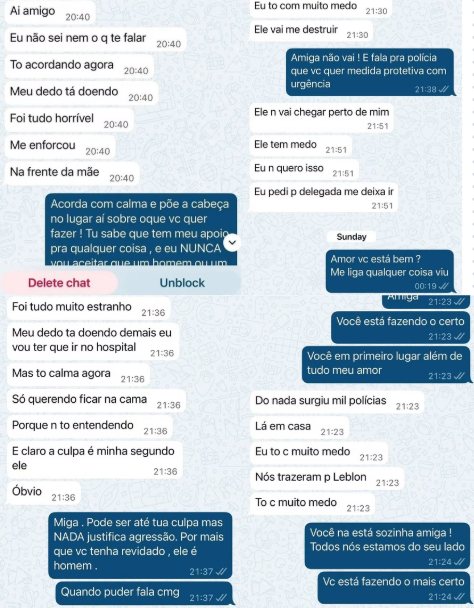 Segundo a mensagem, toda situação teria acontecido na frente da mãe dela. "Eu tô com muito medo. Ele vai me destruir. Ele tem medo, não vai chegar perto de mim".