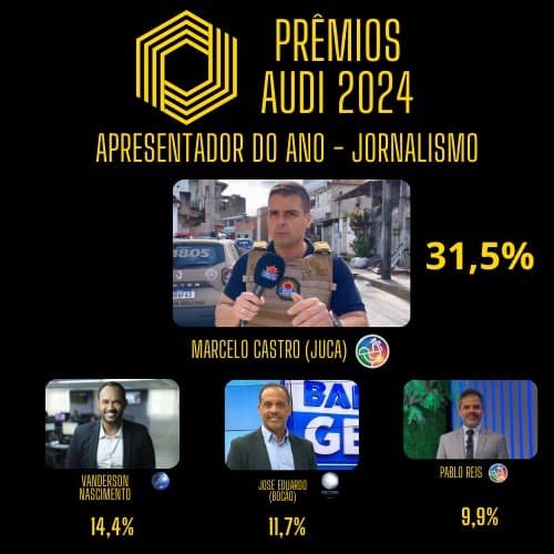 Quem também fechou 2024 com conquista foi Marcelo Castro, que foi eleito com 31,5% votos o melhor apresentador do ano, categoria jornalismo. Ele deixou para trás nomes de relevância local como Vanderson Nascimento (14,4%); José Eduardo (11,7%); e Pablo Reis (9,9%).