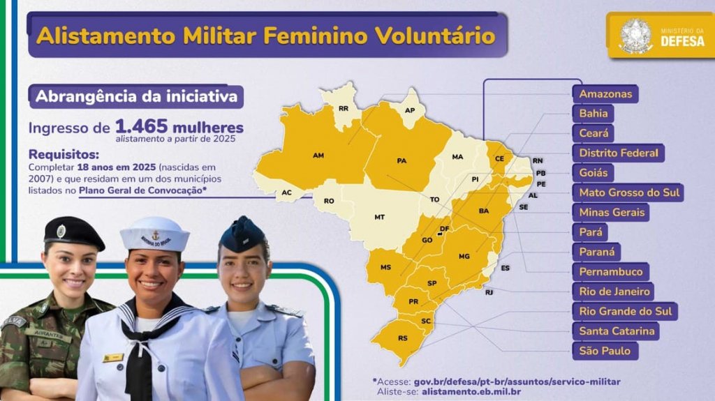 As mulheres que completarem 18 anos em 2025 estarão aptas a se alistar, de forma voluntária. Ao todo, 28 cidades, em 13 estados e no Distrito Federal, estarão aptas para receber as candidatas. Na Bahia, o alistamento poderá ser feito apenas em Salvador.