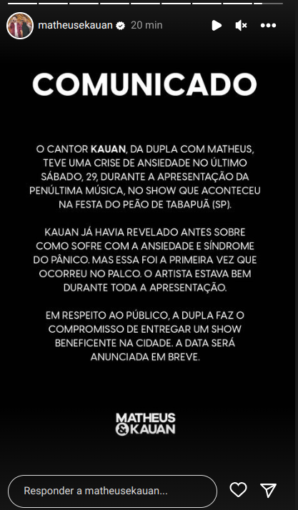 Após a repercussão do vídeo, a assessoria da dupla compartilhou um comunicado explicando que o cantor teve uma crise de ansiedade no palco.