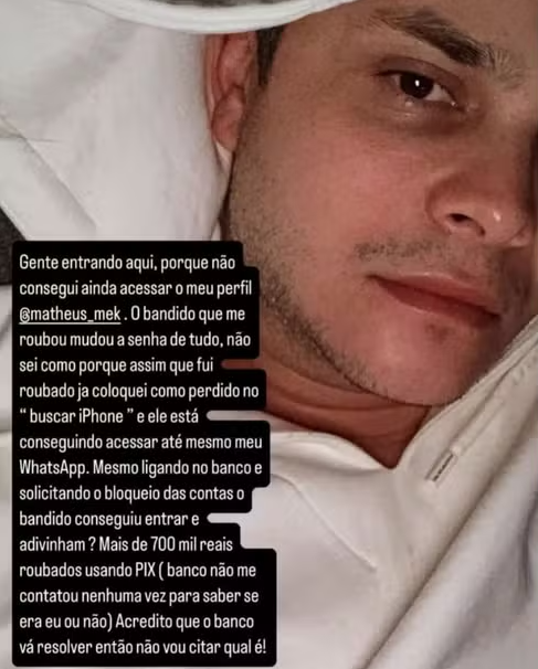 "O bandido que me roubou mudou a senha de tudo, não sei como porque assim que fui roubado já coloquei como perdido no "buscar iPhone" e ele está conseguindo acessar até mesmo meu WhatsApp. Mesmo ligando no banco e solicitando o bloqueio das contas o bandido conseguiu entrar e adivinham? Mais de 700 mil reais roubados usando PIX", disse.