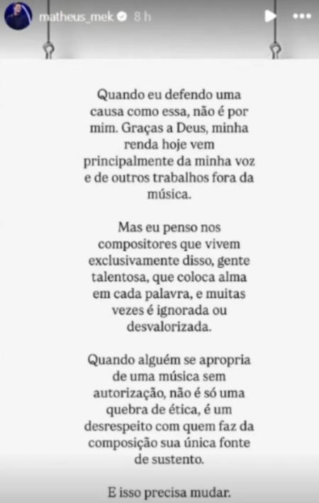 "Gravo esse story primeiramente pedindo desculpa a Matheus, a Kauan e a todos os compositores da música 'Nossa Praia é Amoar'. Essa música que é maravilhosa, essa música que é um grande ícone de Matheus e Kauan, onde eu fiz uma interpretação dela recentemente, e infelizmente, eu não sabia, acontece nessa correria de muitos shows, eu acabei, juntamente com meu escritório, a gente acabou subindo essa música nas plataformas digitais. E desde o meu 'pipocão' em 2023, todas as músicas que eu subo nas plataformas ela tem a liberação. A única música que não teve a liberação foi 'A Nossa Praia É Amar'. Eu não sabia, indaguei ele em algumas coisas, então, queria pedir perdão a Matheus em nome do HC e do meu escritório."