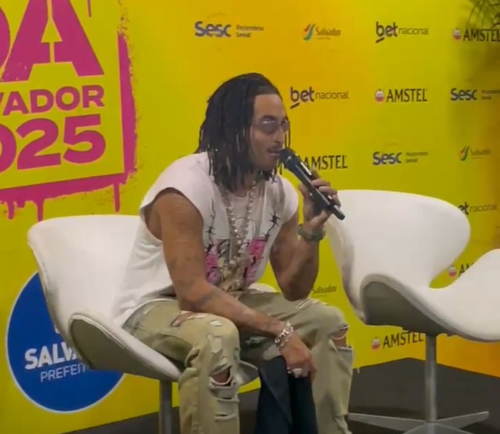 Após agitar o público no Festival Virada Salvador na noite desta segunda-feira, o cantor Matuê, um dos grandes nomes do trap brasileiro, compartilhou em entrevista coletiva qual de suas músicas ele transformaria em um "naipe baiano".