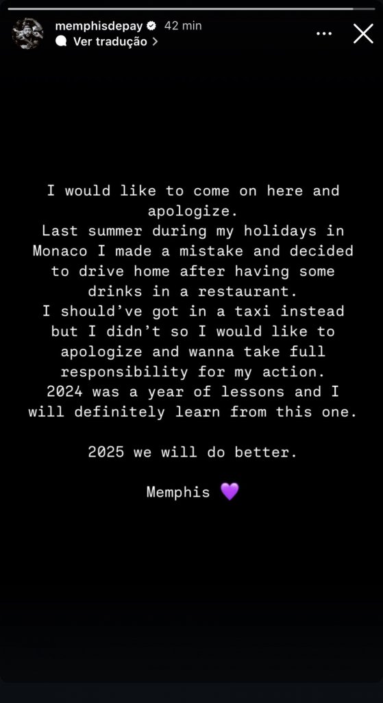 “Gostaria de vir aqui e me desculpar. No verão passado, durante minhas férias em Mônaco, cometi um erro e decidi dirigir para casa após tomar algumas bebidas em um restaurante. Eu deveria ter pegado um táxi, mas não o fiz, então gostaria de pedir desculpas e assumir total responsabilidade pela minha ação. 2024 foi um ano de lições e com certeza aprenderei com esta. 2025 será melhor.", afirmou o jogador.