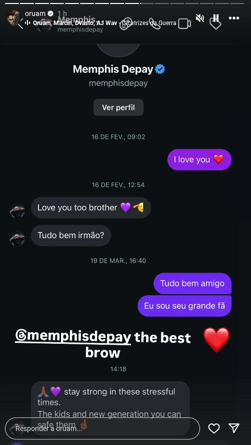 As mensagens compartilhadas pelo rapper chegaram ao atacante holandês Memphis Depay, do Corinthians, que desejou forças à Oruam. “Mantenha-se forte nesses tempos estressantes. As crianças e a nova geração, você pode salvar eles”, mandou o camisa 10.