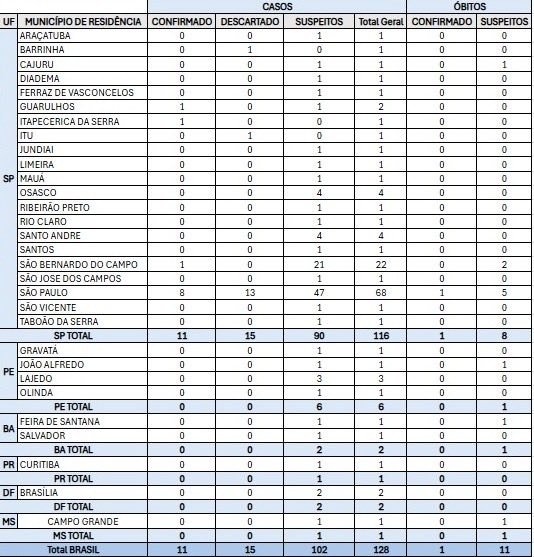 Em relação aos óbitos, dois foram confirmados em São Paulo e 12 seguem em investigação, sendo um em Mato Grosso do Sul, três em Pernambuco, seis em São Paulo, um na Paraíba e um no Ceará.