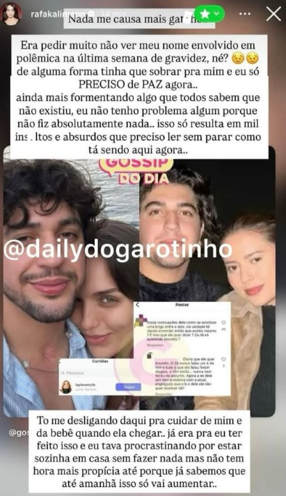 "Era pedir muito não ver meu nome envolvido em polêmica na última semana de gravidez, né? De alguma forma tinha que sobrar para mim e eu só preciso de paz agora… Ainda mais fomentando algo que todos sabem que não existiu, eu não tenho problema algum porque não fiz absolutamente nada… Isso só resulta em mil insultos e absurdos que preciso ler sem parar como está sendo aqui agora", disse.