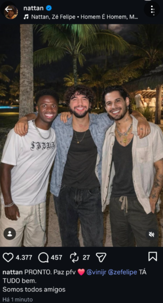 Recentemente, Kalimann precisou se afastar das redes sociais após uma polêmica envolvendo Nattan, Zé Felipe e fãs de Virginia Fonseca e Vini Jr. Na ocasião, o artista compartilhou uma montagem com a foto de Zé Felipe e Vini Jr, e a situação acabou virando para ela, rendendo montagens com ela no centro e os ex-namorados dela.